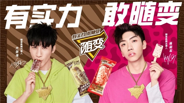 随变还联手@芭莎男士 官宣随变品牌双代言模式一一随变品牌代言人大张伟 X 随变品牌主理人杨和苏。两位代言人的影响力相互叠加,达到 1+1>2的营销效果。一个是人间精品,是中国第一支未成年摇滚乐队的组建人;一个是新锐Young King,是UCLA高材生却另辟蹊径要说唱歌手,两人看似千差万别,却有共同的特质,那就是敢于不限定人生、敢于不做模范标本的态度。品牌代言人大张伟,助力随变从节目中破圈。他率性表达,个人风格鲜明,凭硬核实力获得“音乐 OG”称号,受到众多粉丝长久喜爱,就像随变经典香草口味冰淇淋,承载品牌基因,成就行业中独一无二的识别度,实力诠释巧冰品类20年的经典魅力。品牌主理人杨和苏,凭实力登上多个嘻哈宝座,他敢直说、敢挑战、敢不同的个性不断制造话题,将流量转化为品牌热度。恰如随变软芯莓莓口味冰淇淋,巧克力与大颗冻干草莓的完美邂逅,层次丰富脆感十足,一经问世,便赢得无数关注。