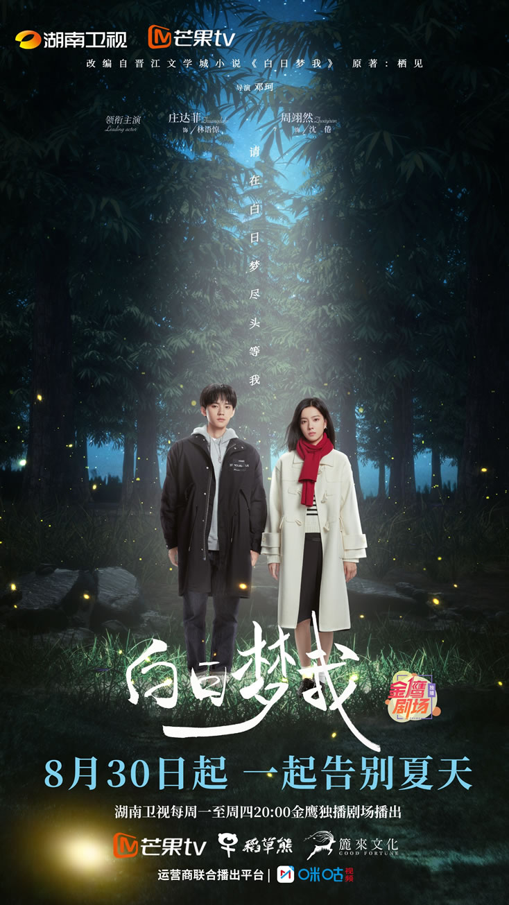 由江苏稻草熊影业有限公司出品、稻草熊影业与上海簏来文化传媒有限公司联合制作的电视剧《白日梦我》将于8月30日20:00正式登陆湖南卫视金鹰独播剧场。该剧由新锐导演邓珂执导,王晗簏担任制作人,夏风颜担任总编剧,庄达菲、周翊然领衔主演,陈鹤一、范诗然、边天扬、王川、廖银玥、锦超等主演,改编自栖见热门同名小说《白日梦我》。剧集讲述了林语惊与沈倦相遇后,二人共同面对人生与家庭困境,共同成长、彼此治愈的青春校园故事。
