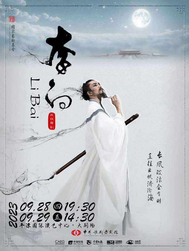 舞剧《李白》是一部讲述中国故事的原创舞剧,以李白的家国情怀和拥抱山水的恣肆情感为依托,从晚年被发配夜郎的人生经历为切入点,用“月夜思”“东巡哥”“将进酒”“归去来”“大鹏赋”为题,选取李白人生中的重要节点,通过他在“入世”与“出世”上的权衡和抉择,揭示李白的内心世界,塑造一个舞剧舞台上的李白。舞剧对唐代的风物和舞乐进行了探索,具有典型的中国文化意韵和美感。