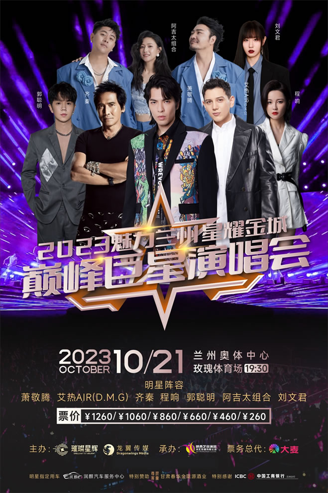 群星云集,唱响兰州,10月21日,2023魅力兰州星耀金城巅峰巨星演唱会将在兰州奥体中心玫瑰体育场精彩开唱,天王巨星萧敬腾金城兰州首次开唱,另有艾热AIR乐队(D.M.G)、齐秦、 程响、郭聪明、阿吉太组合、刘文君等轮番登场,为我们缔造一场超燃的视听盛宴,带你徜徉在音乐的海洋,尽情体会这份欢乐。站在音乐潮流前沿,本次演唱会将为大家带来一场华丽绽放、感动无限的音乐盛典。无论是铁杆粉丝,还是音乐爱好者,这都是一次不能错过的绝佳机会!本场演唱会将精心安排的经典曲目和现场乐队舞台表演融为一体,给观众带来一次美妙绝伦之视听盛宴。丰富多样的曲目包括了萧敬腾、艾热AIR、齐秦、程响等歌手的经典代表作,同时也收录了他们最新的原创音乐。在音乐的灵感激荡下,舞台上将上演一次艺术与灵魂的碰撞,这将是一场盛大的音乐之旅,从动听的旋律、激昂的节奏到深情的情感表达,会引领观众身临其境地感受音乐的魅力。