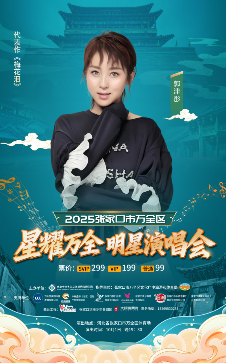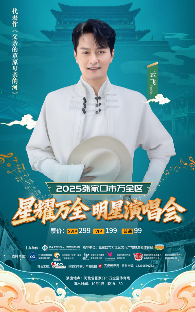 2025年10月1日,张家口市万全区体育场将迎来一场饱含乡情的文化盛宴——“星耀万全”明星演唱会。这场演出因两位主角的身份而备受瞩目:著名歌手云飞将携手爱人、万全籍艺人郭津彤,与吴采乐、郭涛、柳强强等实力唱将共同登台,用旋律编织乡愁,以歌声牵系故土。
