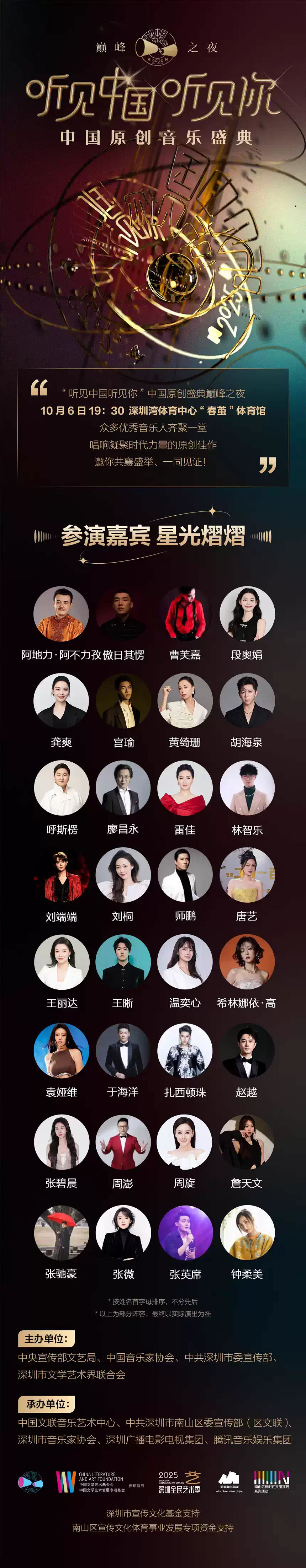 中国音乐家协会歌曲推选品牌活动“听见中国听见你”历经8年,已推出百余首思想精深、艺术精湛、制作精良的优秀作品。2025年10月6日,廖昌永、雷佳、胡海泉、张碧晨、黄绮珊、 希林娜依•高、王晰、袁娅维、温奕心、王丽达、吕继宏、龚爽、扎西顿珠、刘端端、段奥娟等40余位明星将在深圳春茧体育馆,实力唱响“听见中国听见你”经典作品,共度中国原创音乐巅峰之夜!