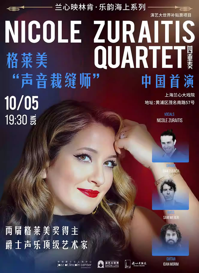 10月5日,上海兰心大戏院再次携手林肯爵士乐上海中心,带来“兰心映林肯·乐韵海上”系列,为大家特别呈现来自美国纽约的格莱美原声现场!格莱美双冠爵士天后 Nicole Zuraitis 同她的爱人格莱美获奖鼓手Dan Pugach,以及另外两位国际超强乐手,首次登陆中国舞台!爵士界高定登场!