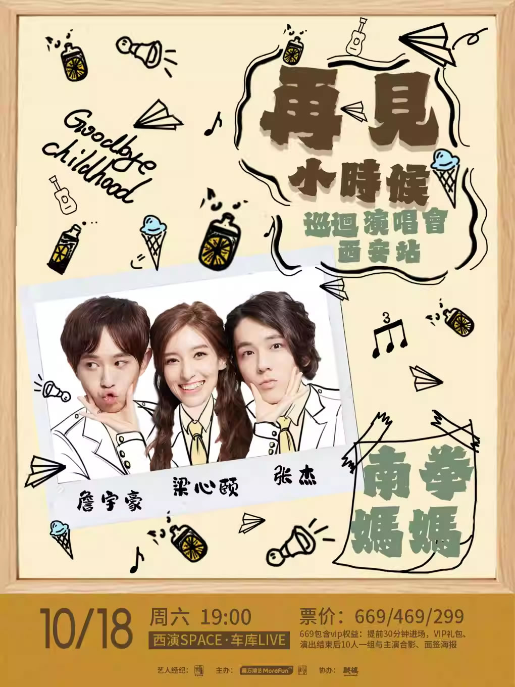 2025年,继去年「我回来了」巡演后,南拳妈妈第二代黄金阵容——詹宇豪(钢琴王子)、Lara梁心颐(甜嗓主唱)、AJ张杰(创作才子)再度合体二巡「再见小时候」!以音乐为笔,变身为“青春纪念册主编”,用音乐策划一场专属你的“青春纪念册”!