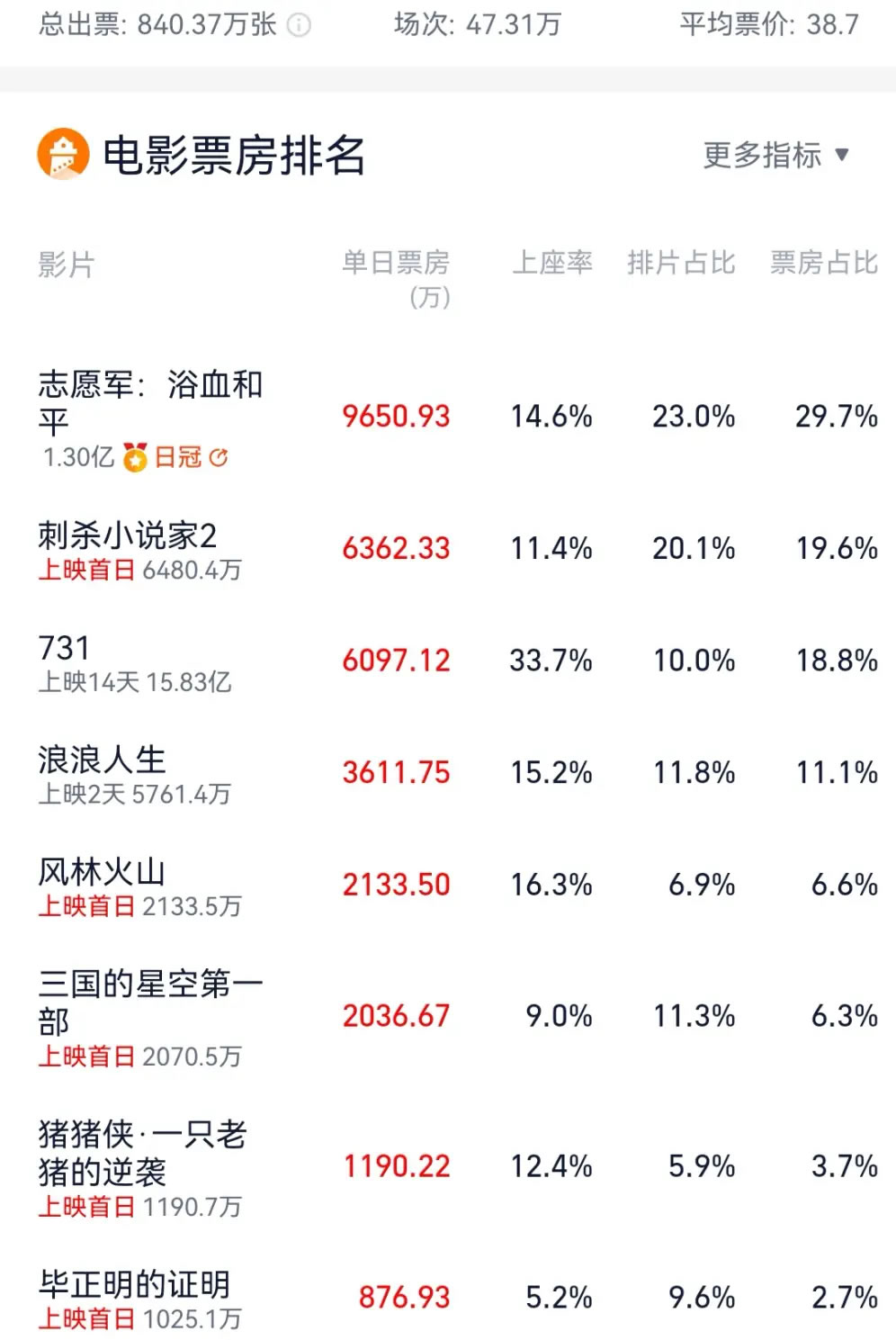 《志愿军:浴血和平》当日排片占比23%,收票房9651万元,略高于2023年国庆的系列第一部《志愿军》,但明显不如去年国庆的《志愿军2》次日的1.53亿元。按此开局,猫眼专业版预测其最终总票房会落在7.5亿元左右,将是系列最低。