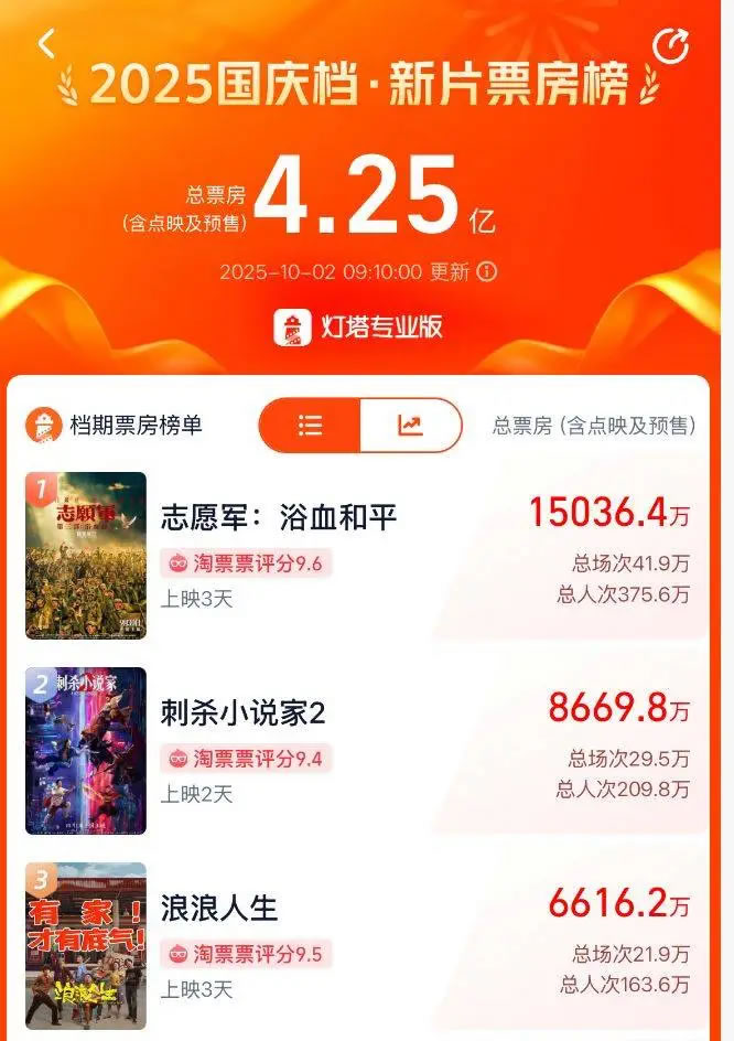 据灯塔专业版数据,截至10月2日上午9时,2025年国庆档票房达4.25亿元,《志愿军:浴血和平》《刺杀小说家2》《浪浪人生》暂列票房前三。