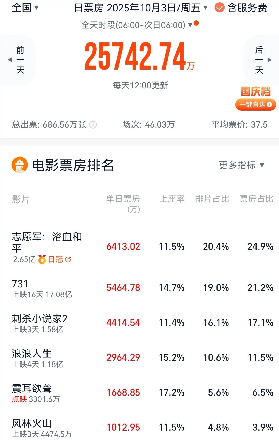 搜狐娱乐讯 (哈麦/文)国庆档《731》持续热卖,单日票房超过《刺杀小说家2》,仅次于《志愿军:浴血和平》,是国庆档第二。