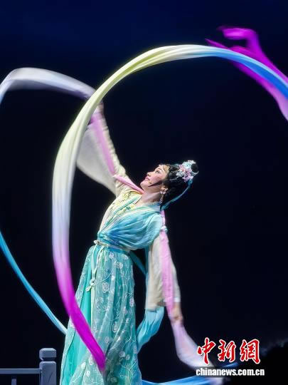 10月3日晚,青年演员谢婉萍在互动式剧场演艺《三山旧梦》中饰演女主角梦清秋。图为长绸表演。福州闽剧艺术传承发展中心 供图