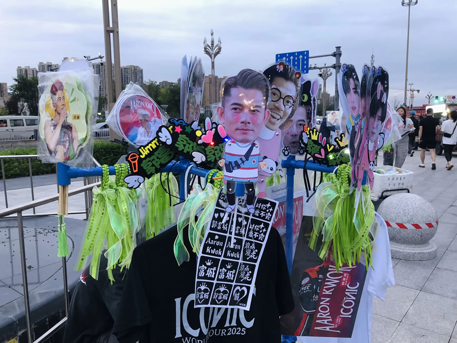 开始暗下来的天色里,人群向着体育馆走去,沿途的铁板鱿鱼、炸鸡排、汉堡、蛋烘糕等快餐小摊前面还坐着不少正匆匆吃晚饭的观众。售卖演唱会周边的小摊上,郭富城的萌化头像正对着行人们微笑,两颊上闪着粉色小星星。