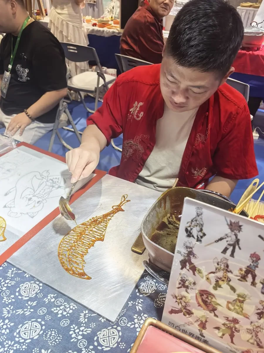 本届CP展专门设置的“次元闹传统”展区,成为推动老字号品牌、非遗技艺与动漫IP深度融合的创意工坊。该展区以非遗市集、美食体验等形式,推动非遗突破边界、走进年轻群体与大众生活,实现文化传承与市场活力的双向增益。展区内,糖塑、宋锦、绒花、剪纸等10多项非遗技艺与《明日方舟》《凹凸世界》《未定事件簿》《画江湖之不良人》等热门IP携手联动。掐丝珐琅传承人陈漪老师正以“掐丝”勾勒轮廓、“点蓝”注入灵魂的古老技艺,重塑《阴阳师》世界的风华角色,让这项非遗在与二次元文化的对话中,展现出跨越时空的生命力。