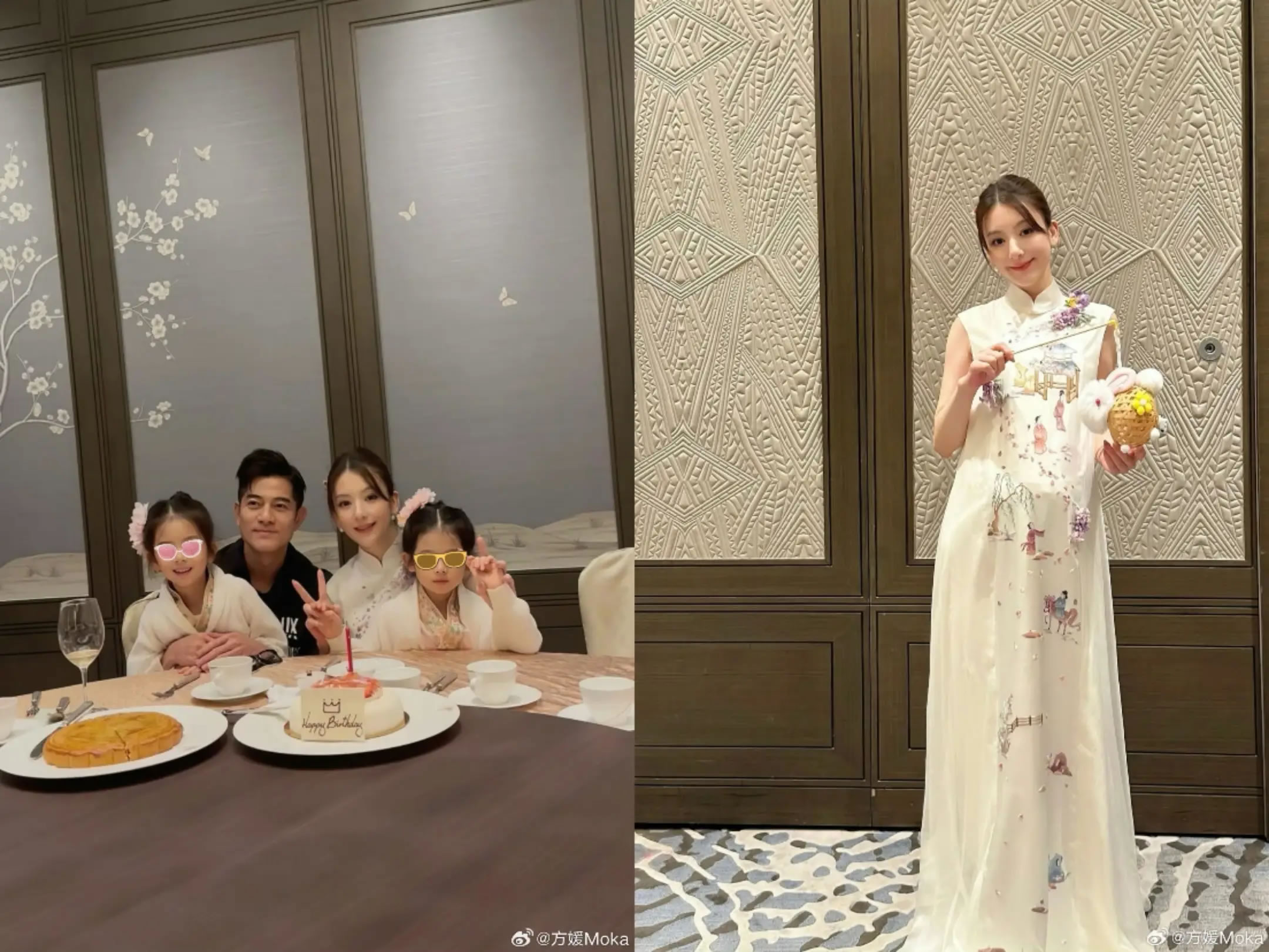 10月8日凌晨,郭富城老婆方媛也在微博分享了一家四口一起过中秋的照片。照片中方媛身着旗袍,手提精致的中秋玉兔灯,孕肚依然十分明显,看得出尚未生产。