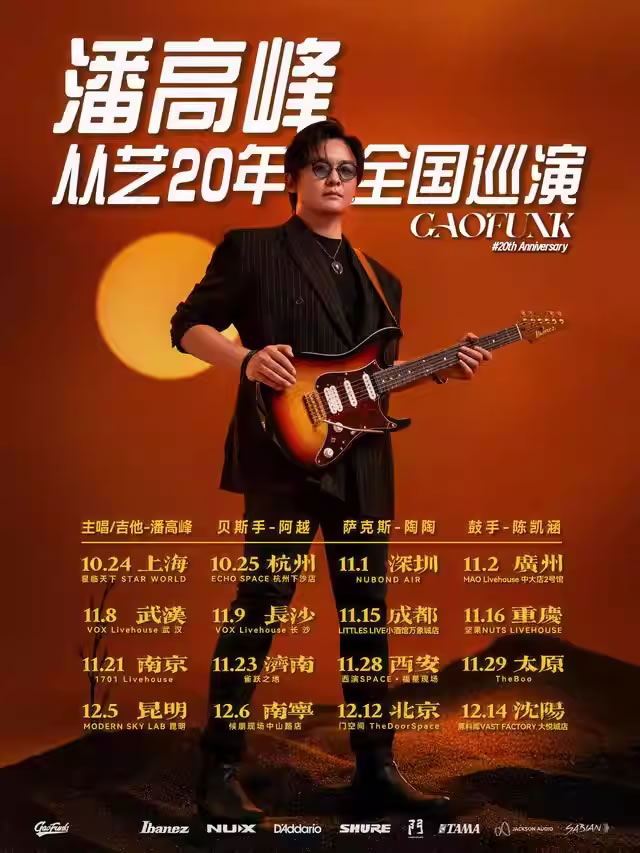 哈喽你好~我是潘高峰~特别开心和你分享这个消息:我已经在音乐人这条路上走过二十年了,这对我和歌迷而言都是个值得纪念和庆祝的时刻。从10月24日开始到年底,我将会携手全新的乐队阵容在全国举行16站专场巡回表演,和大家相聚现场,共同度过这些美妙的音乐~