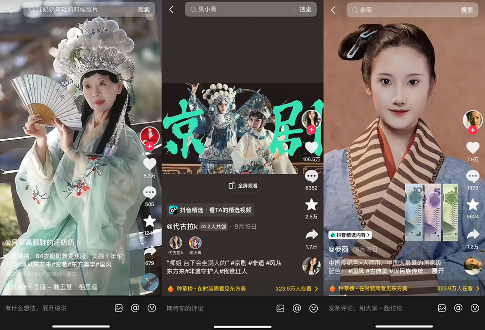 这场“社交狂欢”并非只是年轻人的舒适区,84岁的汪奶奶@只穿高跟鞋的汪奶奶 也通过一段戏服变装诠释了东方女子的古典美。这些内容引发了网友集体共鸣:“原来东方美学不是老古董,而是能融入日常的浪漫”“每条视频都像打开一本东方美学画册”。网友们与创作者热情互动,不仅让话题热度节节攀升,也让更多人意识到:历经时光沉淀的“东方美学”“中式审美”,正在与现代生活方式融合,成为深受追捧的时髦风尚,而想要赶上“时髦”也不需要支付高成本。