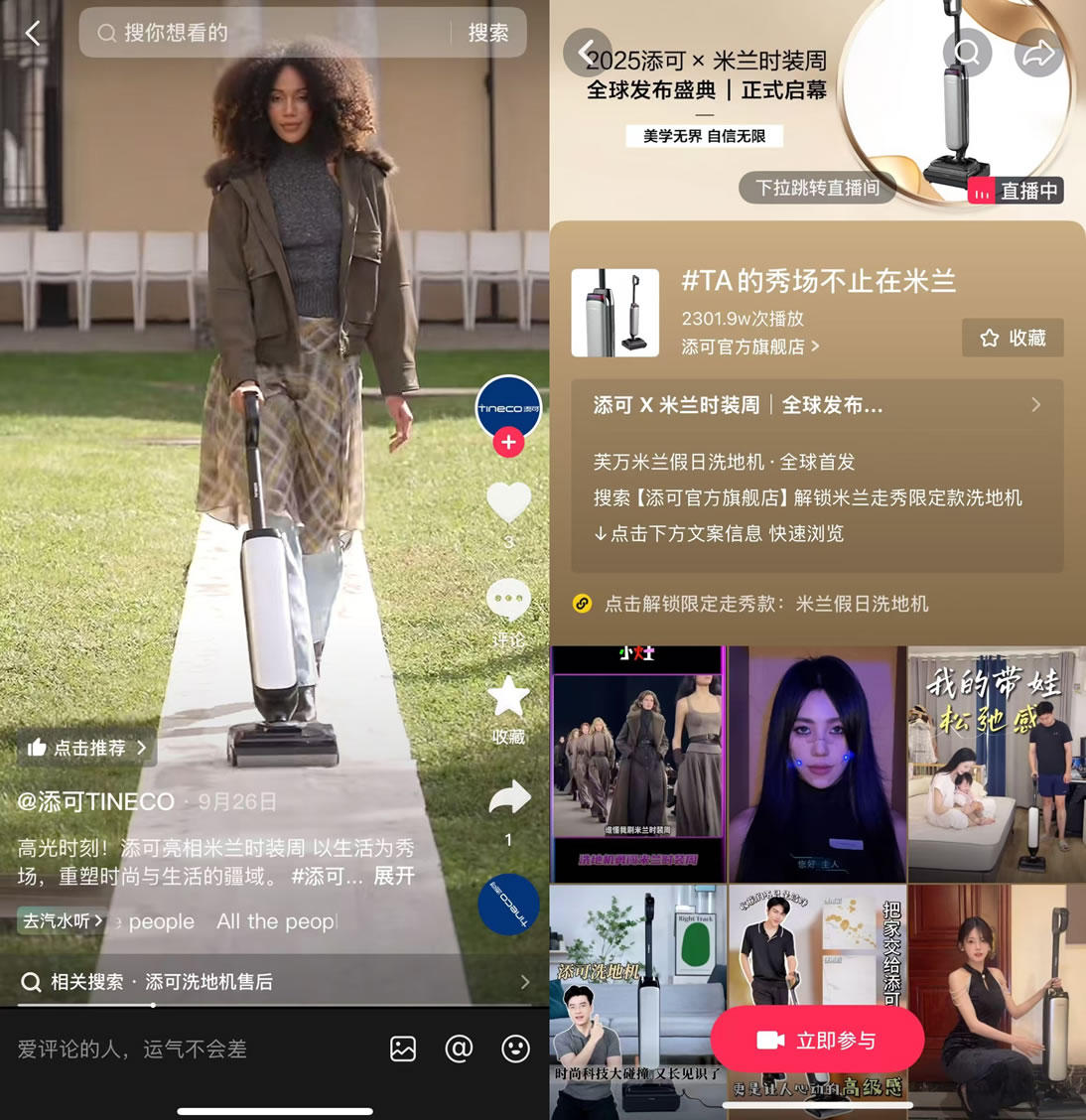 这场跨越文化的交流中,最具突破性的是品牌添可携手Red runway登上米兰时装周官方日程,大放异彩,让东方生活美学成为秀场核心叙事之一。在充满艺术格调的户外庭院秀场,模特推着添可 “芙万米兰假日” 洗地机沿 T 台前行。这样的呈现方式打破了家电新品发布的惯常形式,将东方美学从妆容、服饰、纹样、色彩延伸至日常清洁场景,恰是东方哲学中 “诗意栖居” 的当代实践,也让世界看到东方美学不止于视觉符号,更蕴含着对生活方式的深刻洞察——时尚不拘泥于服饰领域,它存在于生活的每一处细节之中,在自己的秀场中,家电是能让人时刻保持精致和闪耀的底气。
