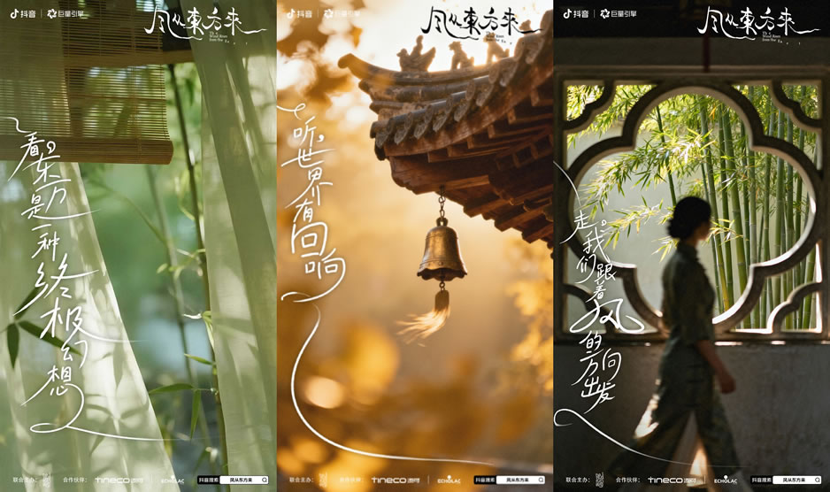 从东方出发,经米兰绽放,与世界对话,「风从东方来」的旅程是一则 “东方美学的全球宣言”——文化的魅力不在于 “单向输出”,而在于 “双向共鸣”。在收获全球瞩目和线上话题热度之后,「风从东方来」发布了一组禅意海报:古建飞檐下铜铃轻摆,配文 “听,世界有回响”;竹帘薄纱与青竹相应,文案 “看,东方是一种终极幻想”;身着旗袍的女子脚步匆匆经过花窗,“走,我们跟着风的方向出发”。这组海报用具象化的视觉符号传递出东方美学中虚实相生、 意趣盎然的审美情趣,借助层层递进的文案,既呼应了 IP 名,又能够让「风从东方来」作为文化符号更具精神穿透力。这种总结式传播不仅延续了话题热度,更让“文化出海”从单次事件变成持续的影响力。