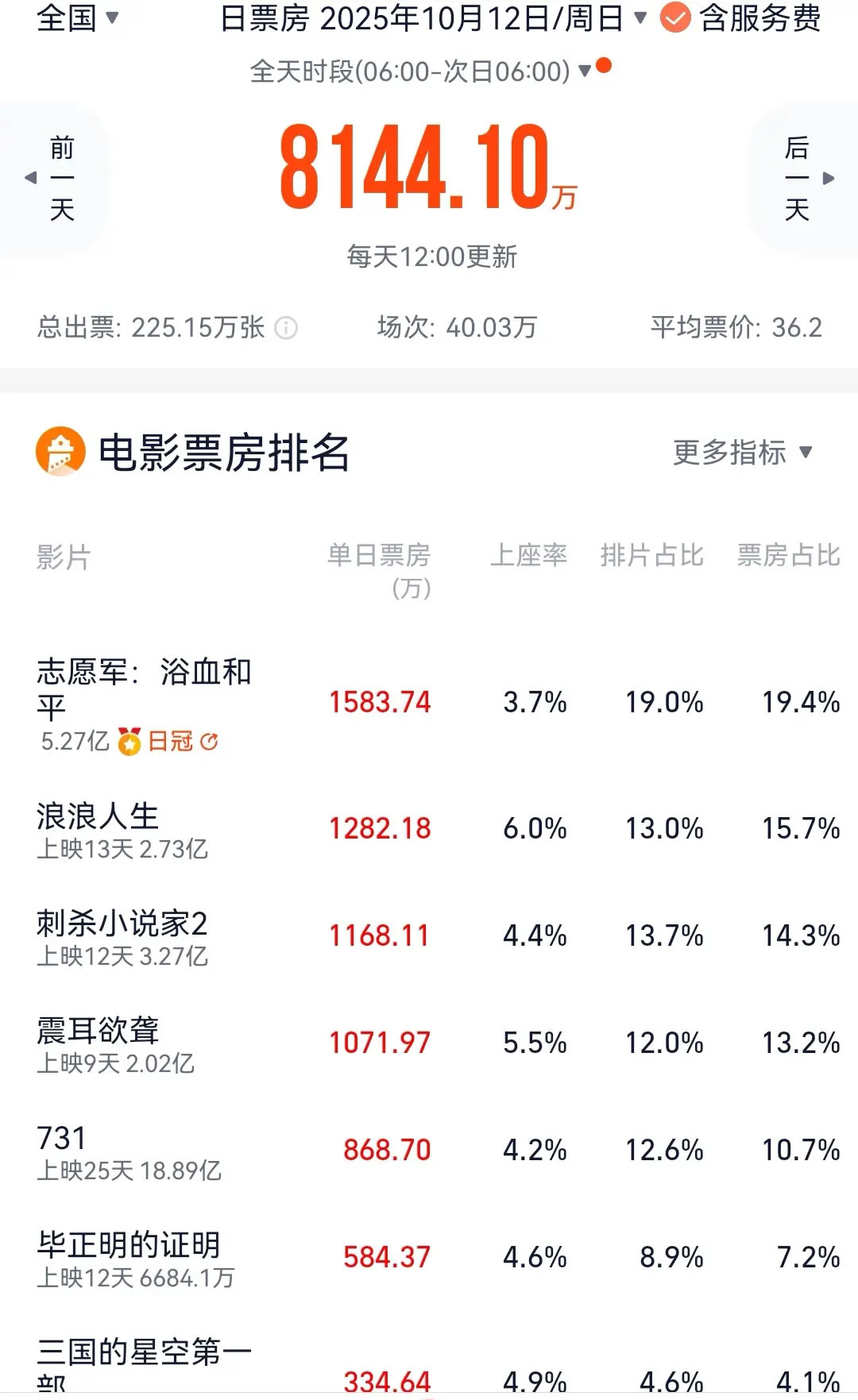 《志愿军:浴血和平》《浪浪人生》《刺杀小说家2》单日票房各1584万元、1282万元、1168万元,排在前三。