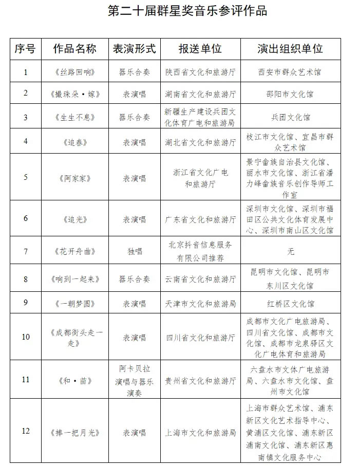 据悉,本次群星奖音乐终评分为两场进行,15:00开启第一场角逐,18:30开展第二场角逐。参与终评的27个音乐作品,经全国各省、自治区、直辖市及新疆生产建设兵团,北京抖音信息服务有限公司层层遴选推荐产生,现场呈现了一场高水准、多元化的群众文化艺术盛宴。