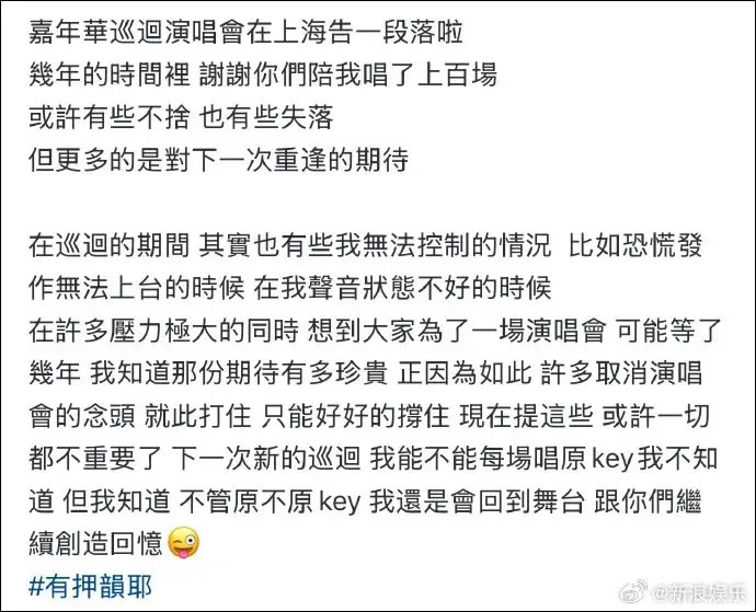今日(10月12日),周杰伦在社交平台发长文,正式与横跨6年、多达110场的“嘉年华”巡演告别,坦言巡演中曾遇恐慌发作、声音状态波动等挑战,但歌迷的期待让他坚持到底。这场始于上海、终于上海的旅程落幕,他驾车离场后折返加唱,用《周大侠》《等你下课》为巡演画上句点。