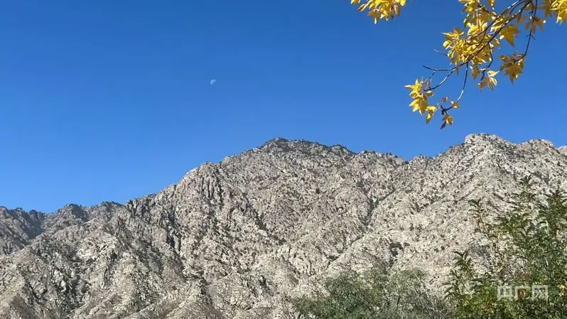 央广网银川10月15日消息(记者李畅 实习记者杨佳)宁夏贺兰山近景,秋日蓝天澄澈,山峰岩石纹理清晰,巍峨耸立。枝头黄叶点缀,与山间绿意及蓝天中的残月共同构成静谧又壮阔的秋日山景,尽显贺兰山的雄浑与秋之韵味。