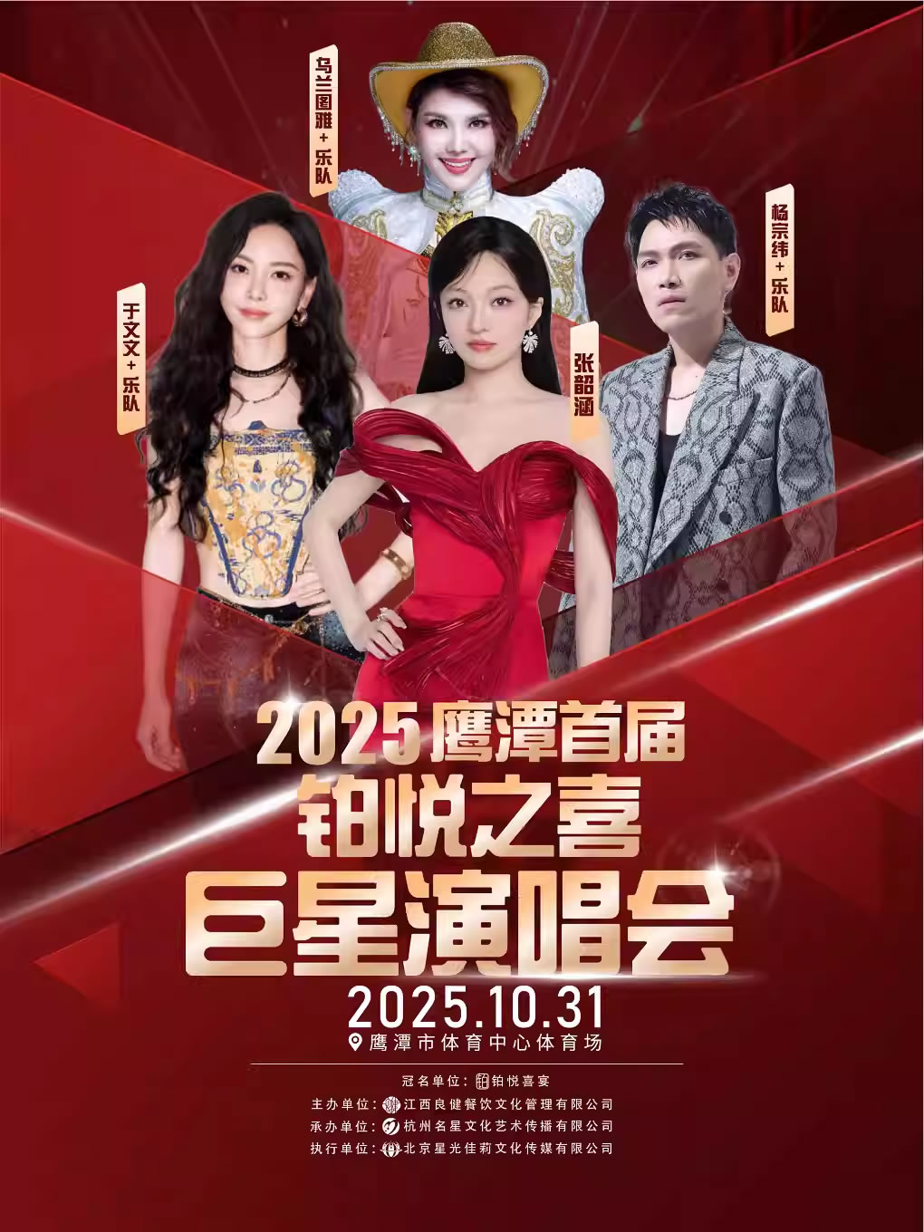 “人生四喜·尽在铂悦“2025鹰潭首届铂悦之喜巨星演唱会于10月31日在鹰潭市体育中心体育场举办,活动主办方有幸邀请到亚洲天后张韶涵、歌王杨宗纬、流量明星影视歌手于文文、蒙古天后乌兰图雅等空降鹰潭,本场演唱会将以一流的音响、璀璨的灯光,绚丽的舞台呈现给大家将是一种新的视觉盛宴,机会难得,不容错过!