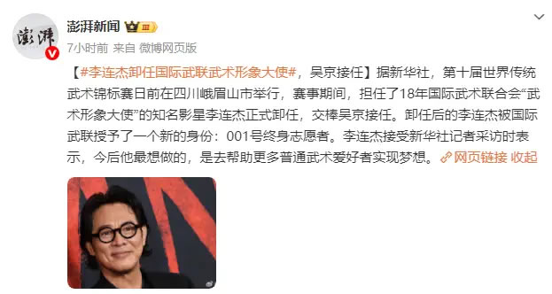 据新华社,第十届世界传统武术锦标赛日前在四川峨眉山市举行,赛事期间,担任了18年国际武术联合会“武术形象大使”的知名影星李连杰正式卸任,交棒吴京接任。卸任后的李连杰被国际武联授予了一个新的身份:001号终身志愿者。李连杰接受新华社记者采访时表示,今后他最想做的,是去帮助更多普通武术爱好者实现梦想。