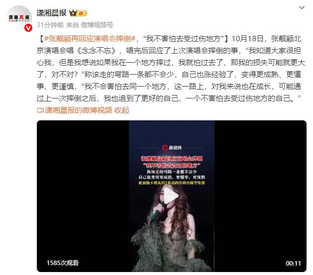 10月18日,张靓颖在北京演唱会唱《念念不忘》,唱完后回应了上次在演唱会摔倒的事,“我知道大家很担心我,但是我想说如果我在一个地方摔过,我就怕过去了,那我的损失可能就更大了,对不对?”