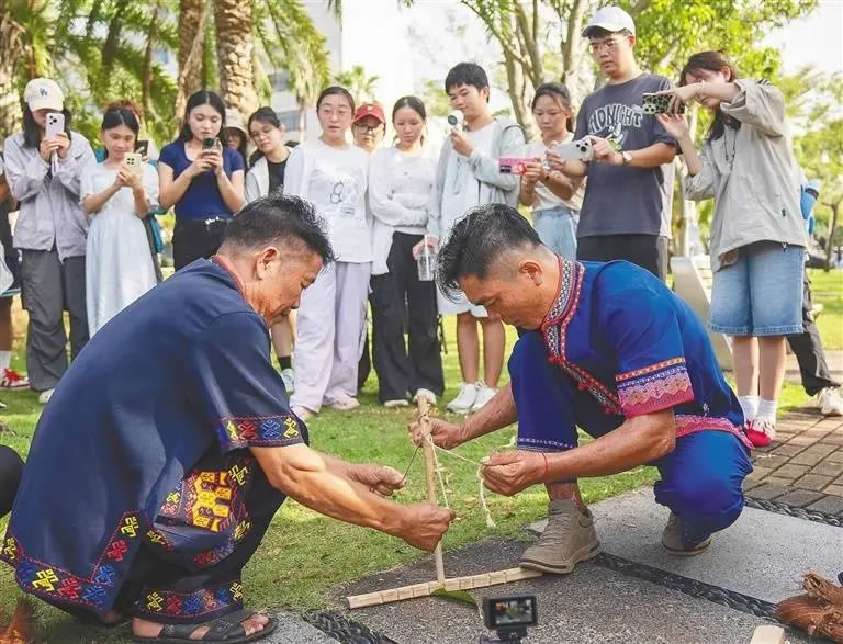 10月17日,在海南大学通识课《非遗传承·黎族特色文化》上,非遗传承人向学生们展示黎族钻木取火技艺。近年来,海南非遗项目持续走进大中小学课堂,受到年轻学子的喜爱。(记者 黄婷)