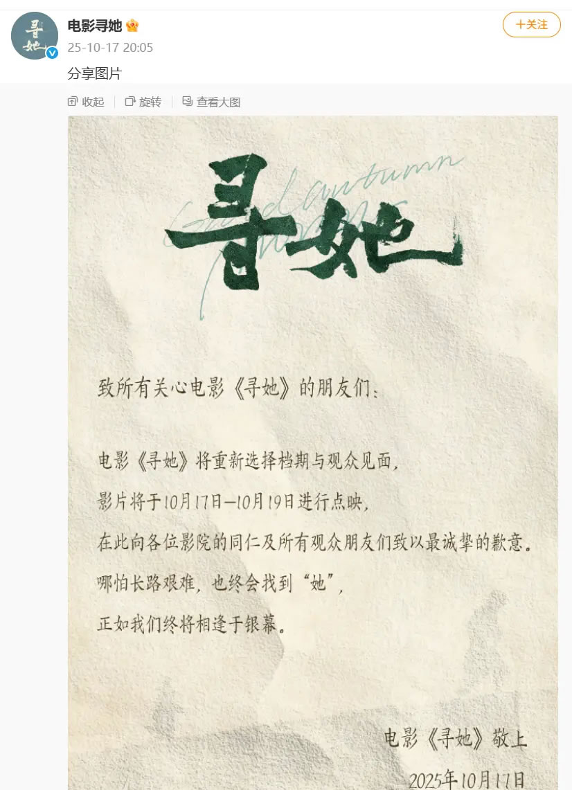 10月17日晚,当天上映的电影《寻她》宣布撤档。