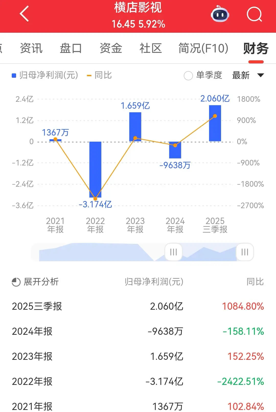 横店影视主要是影院业务,季度盈利跟大盘票房涨跌基本同步。今年第一季度因为有《哪吒2》的爆火,大盘票房同比大增。二季度、三季度的五一档、暑期档票房不及预期,影市走冷,影院盈利因此受影响。
