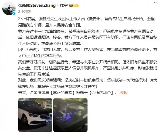 23 日,张新成工作室发布声明,称张新成及团队工作人员于 23 日凌晨飞抵贵阳后,遭两名私生饭从机场开始全程尾随车辆,且未保持安全车距。