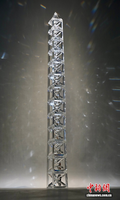 在《映》系列中,蔡志松展现了从宏大叙事向精微内观的形式蜕变,作品呈现出两种相辅相成的面向:比如作品 《天际》,那座11层镂空的锥形水晶塔,以其层层递进、指向“天际”的尖锐结构,在“简洁利落的几何感”中,蕴含着一种理性的秩序与精神的向上感。它通体“通透”,却又能在灯光下迸发出“填满整个空间的绚烂光彩”。这完美诠释了艺术家所追求的“坚实却轻盈,允许一切穿过,又自有璀璨光华”的生命状态。它既是物质的塔,更是精神的塔,象征着在历经层层修炼与提纯后,内心所能达到的既澄澈又光芒四射的境界。
