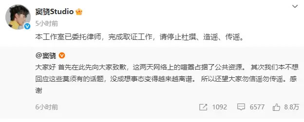 随后,窦骁工作室发文称:“本工作室已委托律师,完成取证工作,请停止杜撰、造谣、传谣。”