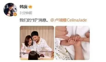 刚刚,韩庚、卢靖姗发一家四口合照、牵手照,并配文:“我们的‘好’消息”,官宣二胎得子。