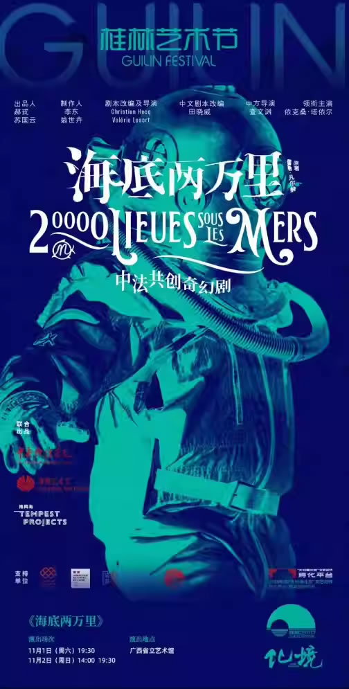 中法共创奇幻剧《海底两万里》由中央戏剧学院、香港艺术节、抱风屿Tempest Projects联合出品。本剧由顶尖法国艺术家与优秀中国演艺团队共同打造,曾狂揽9项法国戏剧最高荣誉“莫里哀戏剧奖”的法兰西喜剧院导演、演员克里斯蒂安·埃克(Christian Hecq)来华驻地创作,与北京、上海、香港等地的艺术家们共同展开《海底两万里》的传奇历险之旅。演出特别邀请著名演员江珊献声旁白,中央戏剧学院表演系教师依克桑·塔依尔主演,为观众呈现这部紧张刺激又妙趣横生的奇幻舞台佳作。