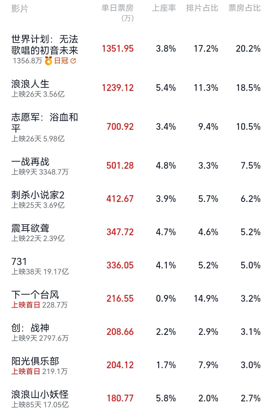 日本动画电影《世界计划:无法歌唱的初音未来》上映首日排片占比17.2%,收票房1352万元,成为日冠,上座率3.8%,远高过两部国产新片。猫眼专业版预测其最终总票房可能过4000万元。