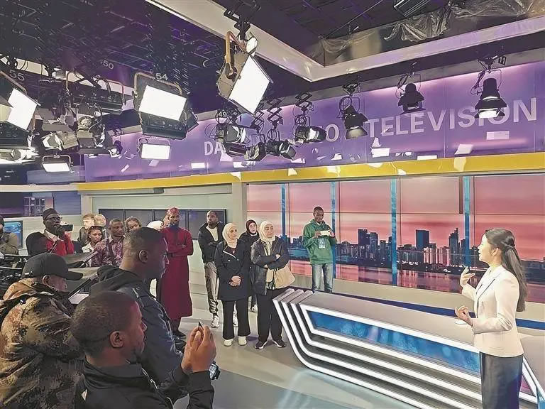 考察团成员饶有兴趣地在可以任意变换的演播厅进行了亦真亦幻的沉浸式体验,体会“不在其中如临其境”的感受。来自尼日利亚联邦首都区中等教育委员会的克里斯蒂安娜说:“在演播厅里就能实现四季的变换,这对我们来说是一件很神奇的事情,因为如果要完成类似的报道对我们来说要花费大量的人力物力和时间。我在这里学到了很多东西,也在考虑如何把这些新技术带回国内,能够在我的国家实现应用。”