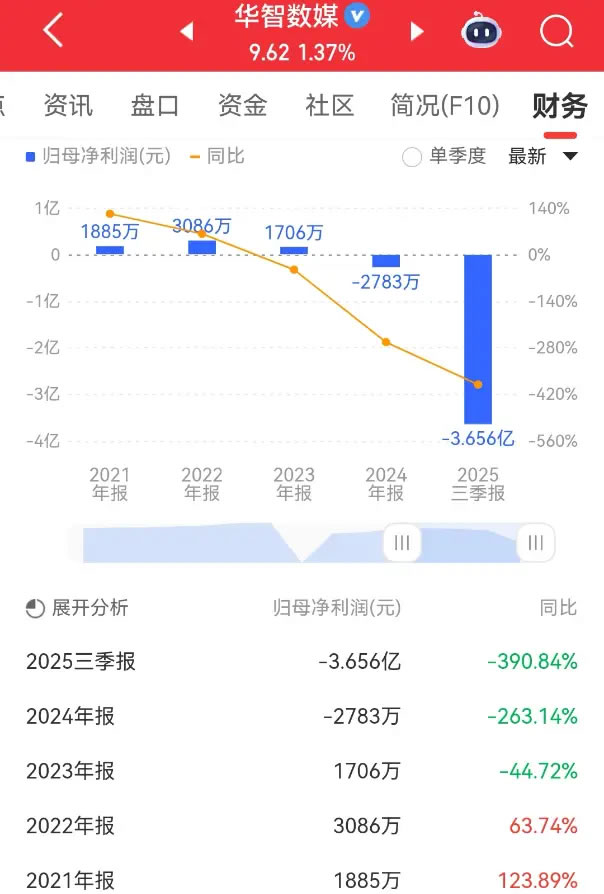 搜狐娱乐讯 (哈麦/文)10月28日晚,上市公司华智数媒公布三季报,前三季度营收1.1亿元,同比增长90.81%。净利润亏损3.656亿元,同比下降390.84%。