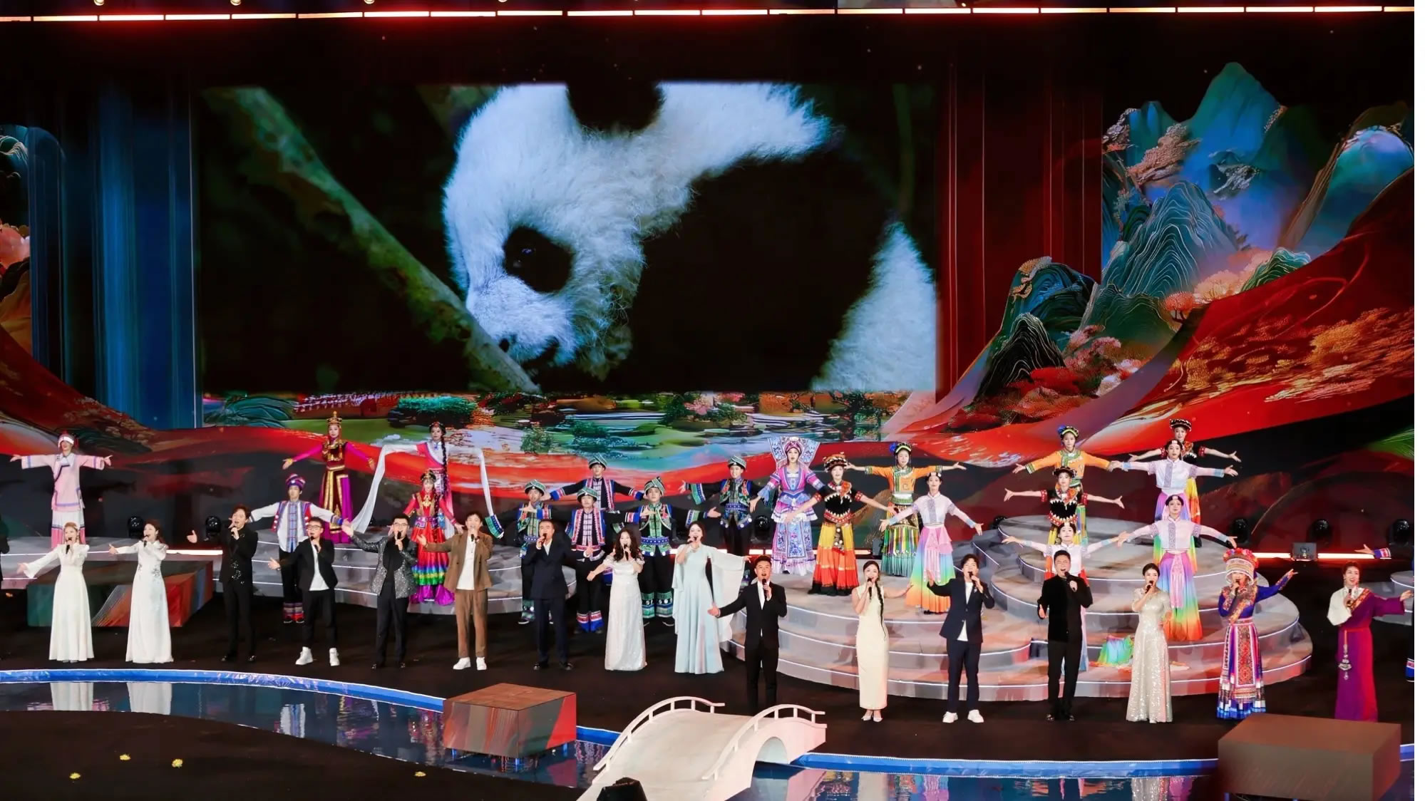 8分钟的舞台创意秀《天府十二时辰》成为全场焦点。三星堆神树造型的主舞台上,说书人以“三寸醒木”串联起十二盏代表不同时辰的灯笼,安逸熊猫与科技熊猫两位虚拟主持人带领观众“穿越”辰时绵阳越王楼米粉飘香、寅时稻城亚丁星空璀璨等四川十二地标场景,勾勒出独属于四川的烟火图景。