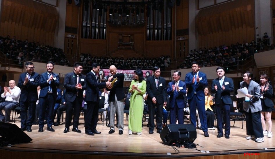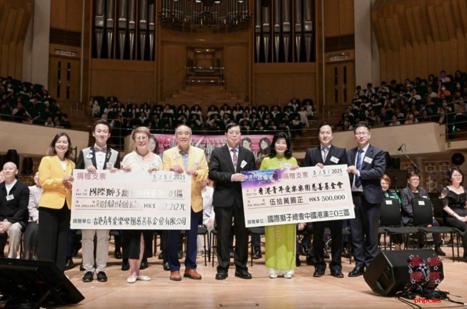 音乐会同步为香港青年爱乐乐团及第108届国际狮子年会筹募经费。在支票交付仪式上,基金会主席蔡朝旭、创会主席赵曾学韫教授、常务副主席林启晖和李攀,与国际狮子总会前国际总会长谭荣根博士、前国际理事文锦欢女士、总监沈颜先生、第一副总监梁凤华女士完成善款交接。