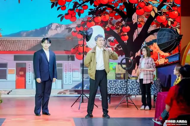 本次“村晚”打破传统观演模式——音乐喜剧《人“声”喜“柿”》中,相声演员从观众席现身,在与观众的互动中,借房山磨盘柿讲述乡村振兴故事;情景表演《逛市集 品非遗》里,身着传统服饰的演员持糖葫芦、糖画等道具在观众席表演,为观众营造出一种穿越感;互动环节《乡村会客厅》则邀请驻村第一书记与好物推荐官同台,展现实干风采;戏曲联唱《姥姥家门前唱大戏》,更是呼应了剧场旁的“姥姥家”民宿。