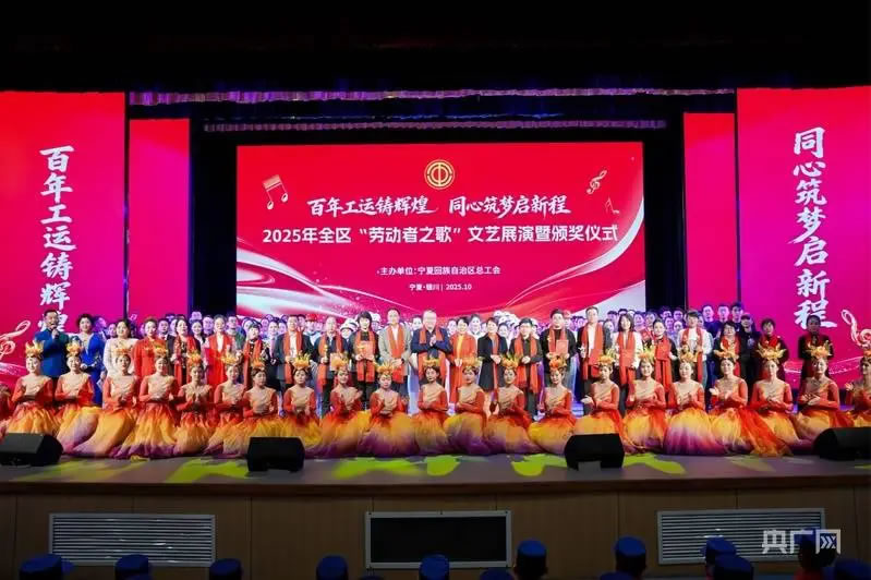 央广网银川11月1日消息(记者齐平)10月31日,宁夏银川市工人文化宫内华灯璀璨,气氛热烈,由宁夏回族自治区总工会主办的2025年全区“劳动者之歌”文艺展演暨颁奖仪式在此举行。宁夏各级劳动模范、获奖单位代表、演职人员及现场观众共400余人齐聚一堂,共同见证了这场属于劳动者的艺术盛宴与荣耀时刻,用精彩的文艺节目深情礼赞劳动之美,激昂唱响时代强音。