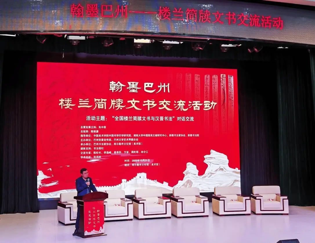 活动尾声,中国书协理事、新疆文联副主席、新疆书法家协会主席张鸿林作总结发言。他指出,本次交流不仅分享了简帛书法研究方法、汉晋书体流变等扎实成果,更通过楼兰简牍中的屯田文书等史料,印证了千年前中原与西域的紧密联结。他表示,新疆艺术学院书法学院已将楼兰简牍内容融入教学,后续新疆书协将进一步支持“楼兰书风”研究,推动简牍资源收集、文化传播,让楼兰文化遗产焕发新活力。