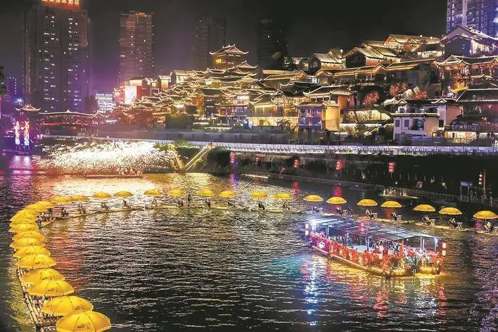 夜幕降临,宣恩县贡水河畔灯火璀璨,“龙游贡水”游船载着游客穿梭于光影之间