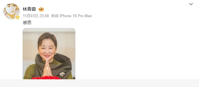 11月3日,林青霞晒出自己的照片庆祝71岁生日,图片中她身穿绿色毛衣,整个人典雅又素净。只见她双手合十,表情温柔又慈祥。据悉,林青霞1954年11月3日出生,华语电影女演员、作家,香港中文大学善衡书院荣誉院士,香港大学名誉社会科学博士。