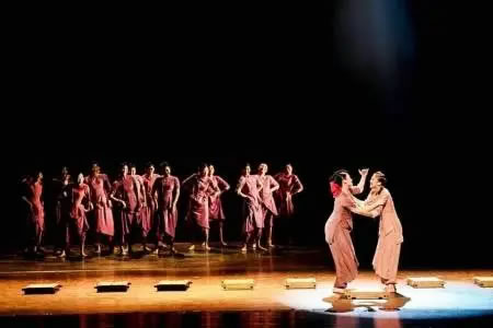 《阿妈就是那座山》中,舞者身着彝族特色服饰,将整齐、丰富的肢体语言与披毡道具等有机融合,呈现山脊、风、臂弯、阿妈的呼唤等意象,展现彝族同胞不屈的品格如山般厚重,爱像群山一样宽广,也表达出当岁月流淌,所有人终将会成为像阿妈一样的那座山。
