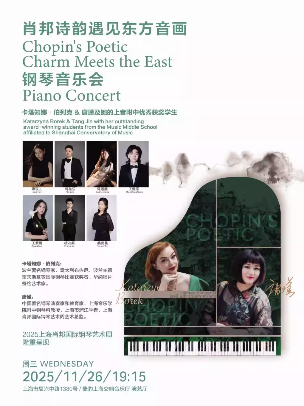 原肖赛评委会主席卡塔琳娜•波波娃•⻬德⻰教授的得意博士生、波兰著名钢琴家卡塔知娜·伯列克(Katarzyna Borek)和著名钢琴演奏家和教育家、上海音乐学院附中钢琴教授、上海肖邦国际钢琴艺术周艺术总监唐瑾,携她的上音附中优秀获奖学生联合献上一台『肖邦诗韵遇见东方音画』的钢琴音乐会,联手打造一场富有文化内涵和意义的“肖邦对话中国音乐”的钢琴演奏会。上海肖邦国际钢琴艺术周组委会策划这场音乐会的初衷,不仅是因为具有“钢琴诗人”之称的肖邦,其音乐精神与中国的古典诗学与美学极富共鸣,更是因为唐瑾作为一名中国钢琴家,除了希望在这个平台上让大众欣赏和领略肖邦音乐之美,同时也能够宣传推广中国音乐和人文文化,并实现中波文化与艺术的对话。届时,波兰钢琴家卡塔知娜·伯列克将会演奏中国乐曲,而唐瑾教授和她的优秀获奖学生们将会演奏肖邦作品,在美妙的音乐中增进中波友谊!