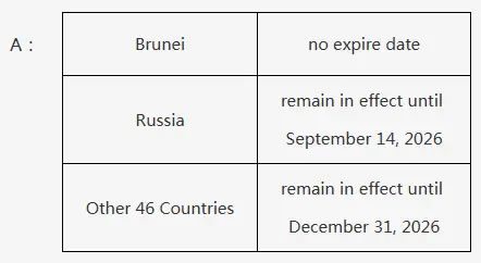 目前,中方对文莱持普通护照人员的免签政策未设施行期限,对俄罗斯持普通护照人员的免签政策施行至2026年9月14日,对其余46国持普通护照人员的免签政策施行至2026年12月31日。