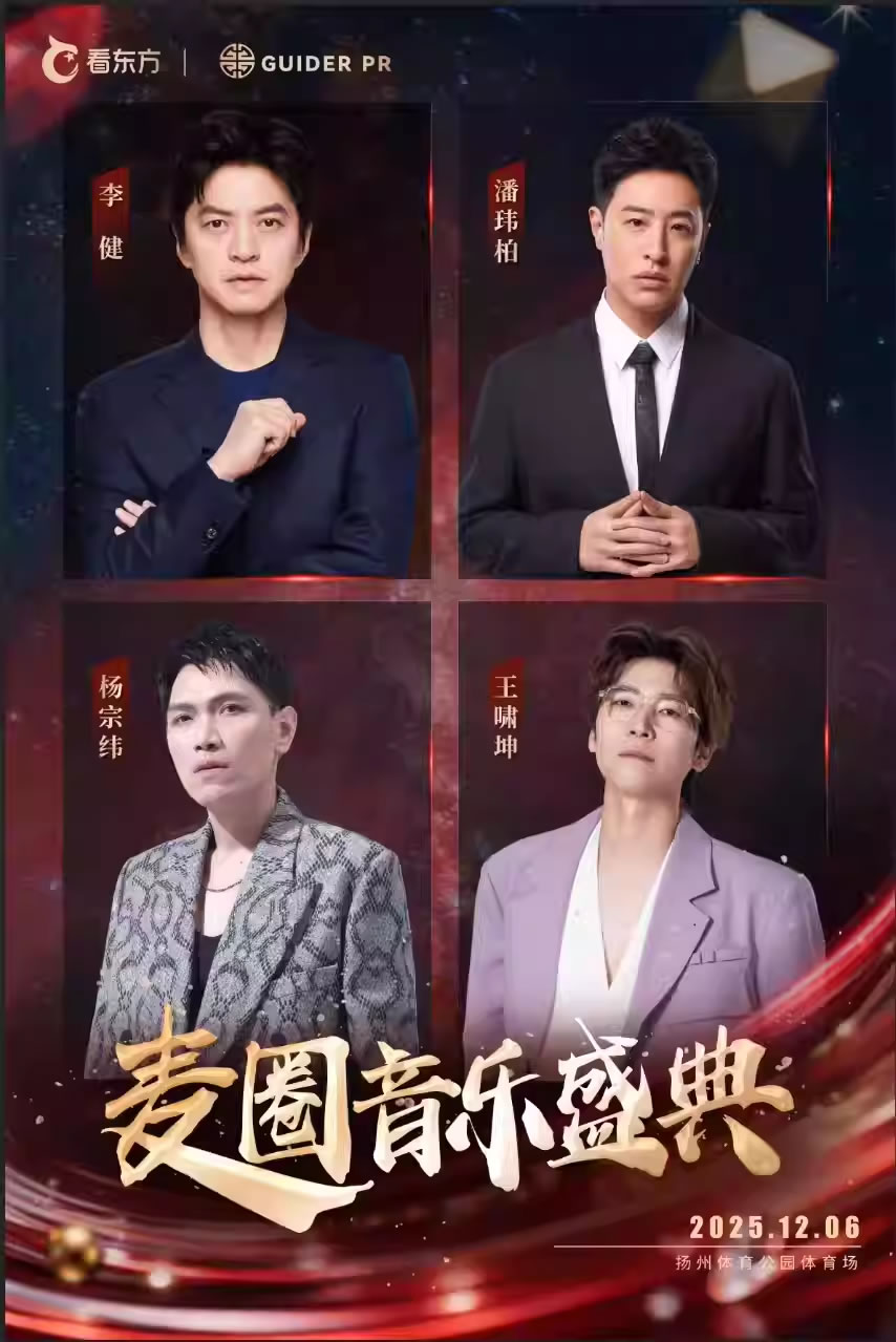 12月6日,由上海广电(SMG)看东方、扬州市新闻传媒中心(集团)联合主办的2025看东方麦圈音乐盛典演唱会——扬州站,将在扬州体育公园体育场温情开唱。李健、潘玮柏、杨宗纬、王啸坤,四位各具特色的音乐人,将用他们独一无二的声线,为您编织一个难忘的冬夜梦境。