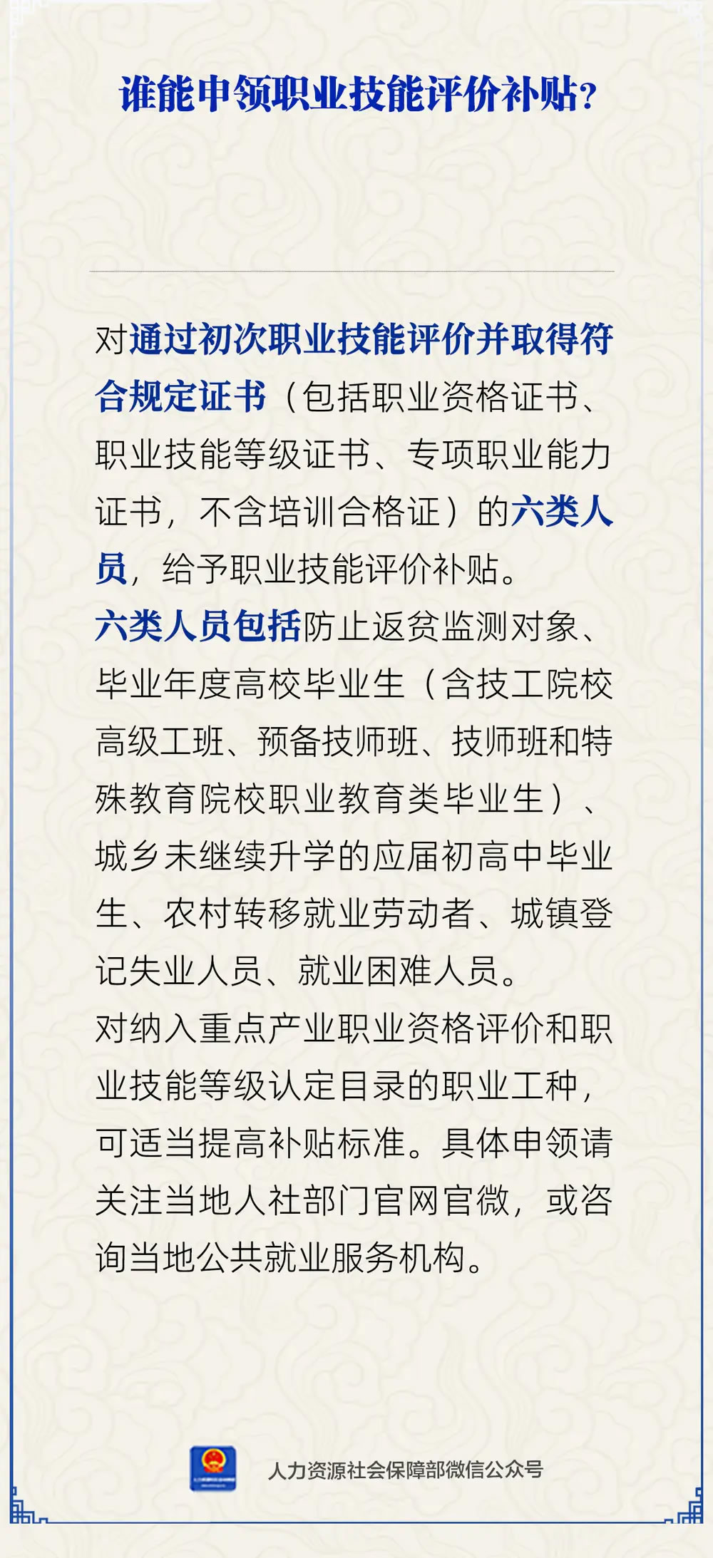 对通过初次职业技能评价并取得符合规定证书(包括职业资格证书、职业技能等级证书、专项职业能力证书,不含培训合格证)的六类人员,给予职业技能评价补贴。