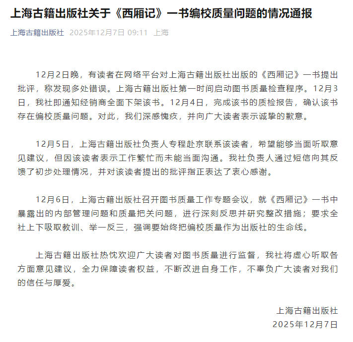 12月2日晚,有读者在网络平台对上海古籍出版社出版的《西厢记》一书提出批评,称发现多处错误。上海古籍出版社第一时间启动图书质量检查程序。12月3日,上海古籍出版社即通知经销商全面下架该书。12月4日,完成该书的质检报告,确认该书存在编校质量问题。对此,上海古籍出版社表示深感愧疚,并向广大读者表示诚挚的歉意。